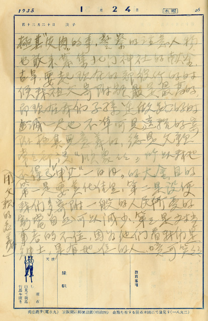 此係吳新榮寫於1935年1月24日日記,警察為建北門神社一事前來募捐,吳新榮對此雖有不滿,仍依父親吳萱草的建議捐獻一百元。   日記中提到的「注意人物」係指吳新榮,他經常受到警察檢視,如1935年1月15日的日記便記載,因朝鮮殿下李垠將來臺,特務即來告知,若要外出需向官廳報備,這或許與吳新榮早年在東京留學期間,因日本政府取締共產黨的四一六事件受累入獄後,受當局注意有關。在1月24日的日記中,吳新榮亦寫道自己明明是受警察注意的人物,警察為建造北門神社一事,特來向他募捐,實為諷刺。另一方面,從這篇日記,我們亦能了解仕紳階級與在地的互動,過往吳新榮的祖父吳玉瓉曾捐獻建立北門郡佳里街,金額亦是最大的。今日,父親吳萱草亦勸吳新榮順應而為,不論警察前來募捐的原因,捐獻可美化佳里,亦可減少一般人民負擔,故吳家願為之。而滅輕民眾負擔一事,從吳新榮行醫時,經常讓患者積欠醫藥費一事亦常可見,醫院因擴建、租地、添購設備、醫療用品以至家庭生活等,皆需花費,致使吳新榮負債不少,然而,在此情況下,每每患者來診後,如對方經濟上不寬裕,吳新榮會讓患者稍緩付費,不過,從日記中亦常見即使到了催繳日,考量對方經濟能力,也不好向患者討醫藥費,因而常導致入不敷出之窘境。