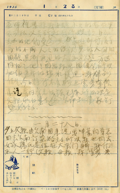 此係吳新榮寫於1935年1月27日日記,前一日許天成家接待吳新榮母親張實拜訪石門腳黃家;吳新榮與妻子毛雪前往銀座拜訪張文波,後同赴西市場滋養軒吃壽喜燒;拜訪黃奇珍,行至南門外師爺塚時,吳新榮向母親說明小妹墓地所在位置;吳新榮好友葉向榮與楊碧霞婚事已談成。   日記中提及的葉向榮為吳新榮好友,亦為佳里青風會同仁,楊碧霞畢業於台南第二高女。葉為向楊碧霞提親,多次請吳新榮夫婦和父親吳萱草協助談婚事,從1935年1月22日吳新榮日記中,即可見吳萱草至楊家說媒,今日談,1月28日正式至楊家提親。而吳新榮夫婦為促成葉、楊二人的婚事,亦多次以媒人身分居中連繫、撮合,從吳新榮日記中經常可見關於葉、楊兩人交往時期至電影院約會的記載。