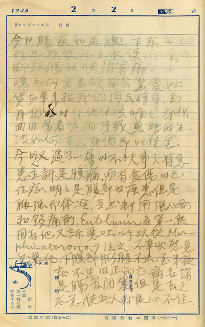 此係吳新榮寫於1935年2月2日日記,今日吳新榮腸疾再發;晚上與葉向榮一同去訪楊碧霞;當晚有一急症患者,雖施予治療,不幸仍於半夜病逝。   日記中提到的葉向榮為吳新榮好友,他們與一群藝文同好者,曾於1933年10月7日共同在北門組織「佳里青風會」,雖然該會不久即解散,但其後續所形成的鹽份地帶文學思潮,至今乃為眾人所津津樂道。吳新榮與葉向榮交友甚深,當時,葉向榮與楊碧霞約會、葉家向女方提親等事,吳新榮夫婦及其父親吳萱草都極用心促成這門親事,吳新榮亦為此事感到極為歡喜而自許為「天下第一冰人」(1937年2月6日日記)。又,日記中寫道急症者驟逝一事,讓吳新榮感到良心不安,回溯吳新榮自1933年9月重拾寫日記習慣後,同年11月也自行開業,日記中便可常見他看診時的相關記錄,諸如疾名、藥品名、患者治療情況等,對於患者前來看診,事後,吳新榮常會反思自己身為醫師對患者疾病的判斷與用藥是否適當。