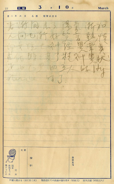 此係吳新榮寫於1935年3月10日日記,記述春天漸至,天暖,人亦歡樂,卻也見數人Hysteria。   閱讀吳新榮日記常可見他對生活、景物、人事、時序的觀察與描寫,文中的Hysteria一詞是用於形容人的極度情緒,近日,或許因吳新榮恰好與某些人的往來而有此感觸。如同日記所述,春天是天暖花開人歡笑的季節,我們也常聽到俗語將季節擬人化,最常見的是「春天後母面」的說法,或許吳新榮有切身的實際經驗,才讓他更有所感吧。不過,吳新榮對於春之描寫也是有正面的表述,比如吳新榮喜愛讀書,在1936年2月16日的日記中寫道:「春雨霏霏,餘暇讀書」。也有對於時節的觀察,如在1937年2月21日的日記中寫道:「春風怡盪,就是這樣氣溫大昇,風塵又起。」這樣對季節的觀察描寫也是閱讀吳新榮日記的有趣之處。