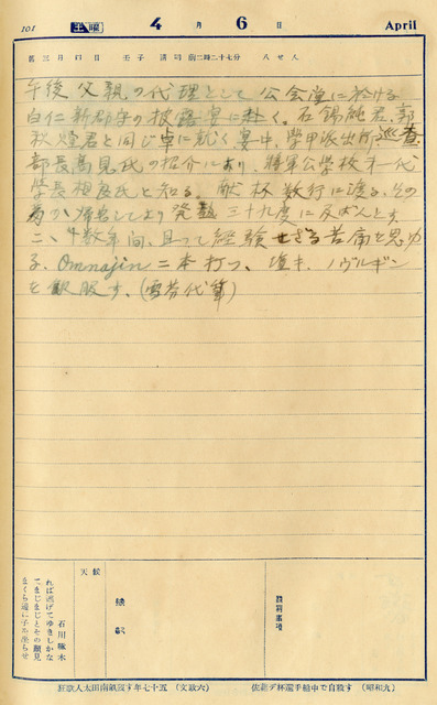 此係吳新榮寫於1935年4月6日日記,下午代表父親吳萱草出席新郡守白仁寶一在公會堂的就職宴會;因在宴會上飲酒過量,返家後導致發燒幾近39度,自行打了兩針醫治。   因父親吳萱草參加台灣新聞社舉辦的觀光團至日本旅遊,所以吳新榮代替父親出席新任郡守白仁的就職宴會,這場宴會上參加者有石錫純、郭秋煌、學甲派出所巡查部長、將軍公學校第一任校長等人,可以看見當時政治、教育、商業以及如吳萱草這類傳統士紳,以及台灣人與日本人之間的人際往絡。又,日記中提到吳新榮因飲酒過多,返家後高燒,而自行施打藥針。這一晚身體果真不適,日記是由妻子毛雪芬代筆。
