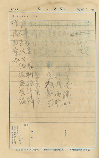 此係吳新榮寫於1935年5月28日日記,昨晚與友人決議成立台灣文藝聯盟佳里支部。   日記中提到的臺灣文藝聯盟是1934年5月,張深切、賴明弘等人在臺中成立的文藝團體,成立大會上即推選出北、中、南三區的委員,據賴明弘回憶,吳新榮即成立大會上的南部成員之一。文聯成立後,南部地區以嘉義為主要據點,爾後有設立佳里支部的構想。吳新榮在1935年5月6日日記寫道,因郭水潭來訪,有了佳里設文聯支部的計畫,後續亦有數次的討論,於在5月27日決議成立台灣文藝聯盟佳里支部,5月28日的日記亦規劃了主要成員的工作職務,於6月1日在佳里公會堂舉行成立大會,當時,佳里支部成員出席者有郭水潭、徐清吉、鄭國津、葉向榮等人,與會者來自台北、台中、嘉義、台南、屏東等地,林茂生、張深切、葉陶、王烏硈等人皆是座上賓。