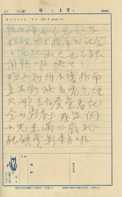 此係吳新榮寫於1935年6月17日日記,今天是始政四十週年記念日,晚上抱著吳南星到街上看電光煙火,再去佳里公會堂看影戲。   1895年6月17日,樺山資紀領日軍自基隆澳底登台後,進行台北城,同時下午舉行始政典禮,故訂6月17日為「始政紀念日」。1935年適逢始政四十週年,臺灣總督府自10月起在全台舉行「始政四十週年紀念臺灣博覽會」,在台北、新竹、台中、嘉義、台南、高雄、台南等地皆設有展覽館,展出類型涵蓋物產、經濟、教育、文化、公共衛生、地方區域等,並以之作為館名,相關紀念行事和活動皆帶有展示日本治理殖民地台灣成果之用意。同時,博覽會的海報設計與文宣,以及在各種記念行事上亦會運用不同方式推廣與宣傳,如宣導手冊、歌曲、電影、紀念戳章等具有特色的設計。6月17日這天適逢紀念日,各種行事已陸續開展,喜歡看電影、戲劇的吳新榮,這天晚上抱著愛兒南星一起到佳里公會堂看戲,夜晚街上還有使用電燈投放的電光煙火。吳新榮對各始政紀念日的各項活動應頗為關注,從日記中尚能看見在1935年11月6日的日記裡,記述他與妻子毛雪到台南市內看台南歷史館的展覽,11日再北上參觀。