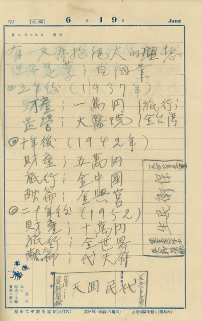 此係吳新榮寫於1935年6月19日日記,對自我未來5年後、10年後、20年後,自行開業的理想描繪。   從吳新榮日記中常可見他對經營佳里醫院、擴建病房、增購家屋等等的規劃,這一天,吳新榮又開始抒發對未來的一些新想法,這次是關於自行開業後的各項計畫,包含:財產儲蓄、醫院造營、旅行計畫、獻匾等方面。從日記中能看見在財產規劃方面計畫逐年增加,還要建造大型醫院,計畫前往旅行的地點從全台灣跨足全中國。其中,在獻匾一事上,他擬列季節都在冬天,兩個時間點分別是1942年和1952年,前者寫「保衛民生」獻給金興宮,後者則寫「回民回天」獻給南鯤鯓代天府。從題字來看,這兩塊獻匾都與醫事有關,有趣的是吳新榮對自己的署名,1942年的寫「東京醫學士吳新榮獻」強烈東京醫學士的身分,1952年則寫「台灣……吳新榮獻」,不知他在何種心境下寫出「台灣」二字,而那欲言未盡的部分更留下無限想像。