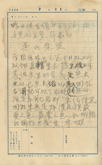 此係吳新榮寫於1935年7月11日日記,到保甲事務所為女兒朱里保戶口。   吳新榮夫婦的長女朱里於6月28日誕生,名為朱里。因女兒出生已超過十天,吳新榮在這一天到保甲事務所辦理出生登記時,被要求提出說明書,而當時的保甲事務所的業務性質類近現在全台各地的縣市政府戶政課。吳新榮將女兒命名為「朱里」二字,如他在文中所言,若欲強調此二字的意義,可解釋為「朱化佳里」,因朱色是漢民族最喜愛的顏色,亦是明朝的國姓。1933年11月,長子南星出生時,他亦與長輩們一起為命名,認為南星之名即「南方的星光可照世界的和平」,長子照耀世界,長女慶耀佳里,都可見吳新榮在取名上對孩子寄予的期望。如同吳新榮在1935年6月30日對自己這上半年的回顧,父親吳萱草完成日本觀光旅行、台灣文藝聯盟佳里支部成立、長女朱里誕生,同為值得紀念的事。