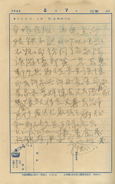 此係吳新榮寫於1935年8月7日記,昨晚因大雨未歸,今天先至慈惠院訪王烏硈,再訪許、黃兩家,後去台南醫院探病吳乃占;下午在銀座通巧遇毛昭癸、毛昭江等人,同去森永晚餐;去林、小出兩間百貨行購物,後與王烏硈、毛昭葵等人到Kapitan;夜宿慈惠院,始發現患蟯蟲症。   前一晚赴黃錡家道賀,因夜雨不止致輕軌停駛,故夜宿友人處。今天一早開始,吳新榮開始在台南市區內的一日行程,日記中提到的Kapitan、林百貨和小出百貨店,昔日都位於末廣町一帶,其中,寫作「林」,日文為「はやし」,始於1932年,戰後曾一段期間閒置,1998年列為市定古蹟,後經整建修後,於2014年重新開幕,今為台南市知名景點。   又,日記中提到的蟯蟲症是寄生蟲傳染病,病原為腸道寄生蟲,在吳新榮日記中有不少篇幅寫道他與家人同患蟯蟲病或治療後復發的情況,患此病時,會自行施藥驅蟲。如1935年12月18日日記寫自己蟯蟲症復發、1937年6月1日寫道全家人都患蟯蟲病,由於這類病徵與飲水不潔、食物未煮熟有關,因而吳新榮才會自稱「不文明人」。