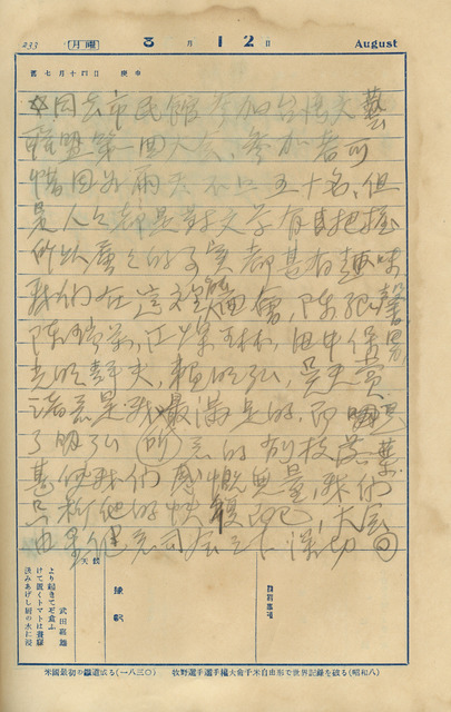 此係吳新榮寫於1935年8月12日日記,記述今日上午從台中搭火車回南部,有感台中具地理優勢、人材輩出,故盡有的文化、政治運動都在這裡發生。   1935年8月11日,台灣文藝聯盟在台中舉行的台灣全島文藝大會,吳新榮與王登山、鄭國津、葉向榮等友人一同出席。回顧台灣歷史的發展,許多文化與政治活動確實都自台中發軔,或是與台北發起後,再與台中串聯,我們由吳新榮日記中即可見此特徵。如這幾日參加的台灣文藝聯盟活動,成立於台中,之後在南北各地分設支部,形成重要的全台型文藝集結團體。又如中央書局,由台灣文化協會成員所設立,當時販賣日文和漢文的書籍雜誌,作為知識流通與傳播的重要平台,至今亦是重要的文化景點指標。再如日記中提到的宮原博士,即宮原武熊,他在台中開業、與台灣人往來,之後又參選台中州議員,呈現當時台日人之間在政治上的交友網絡,從中更可見當時台中地區的台灣文化人對文化與政治事務的參與,而吳新榮在日記中所提的地理優勢,或許正是指台中位在台灣中部,可南北串聯、發展的特點。