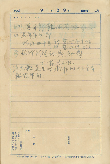 此係吳新榮寫於1935年9月29日日記,《日本醫事新報》回覆吳新榮出生年月日為1907年10月12日,役所登記為11月12日。   日記所提之《日本醫事新報》是日本醫事新報社於1921年創刊,創辦人為梅澤彥太郎,這位第一任創辦人,原就讀東京慈惠會醫學專門學校,中途退學後,進入醫學雜誌的行業,曾任《日本之醫界》編輯長,後創辦《日本醫事新報》。日本醫事新報社自營運開始,即專營醫學系書籍、雜誌之出版事務。日本醫事新報社自創辦初期便不偏屬任一醫學會、醫師會或醫學校,在《日本醫事新報》第1號的宣言中即表明以「破壞醫界沈 滯腐敗的要素,開拓清新的新天地」作為雜誌的走向。雜誌在編排上有:卷頭語、專論、隨筆、調查欄、藥價表、海外事情、人事案內欄、漫畫、文苑等,是一質量俱佳的醫學雜誌,與日本厚生省、日本醫學會、各相關同業形成密切網絡,為響應當代數位化時代亦開發電子版雜誌。這本雜誌自1921年代便有其聲譽,也是身為東京醫學士的吳新榮眾多閱讀書單中的一類。   又,吳新榮在這一天的日記記載《日本醫事新報》和役所登記的出生日差了近一個月,《日本醫事新報》回覆吳新榮出生年月日為1907年10月12日,役所登記為11月12日。從吳新榮所撰《此時此地》中可知他出生時身體虛弱,患黃胆,一直到滿月(即陽曆11月12日)家人才為他報戶口。早期台灣為農業社會,多數人務農,並不興報戶口的的意識,新生兒出生後,會待農閒時才去報戶口。又或如吳新榮的情況,新生兒出生時因身體健康因素或為求平安,家長會待新生兒滿月才報戶口,遲延報戶口是當時台灣社會常見的現象。又如吳新榮的長女朱里出生時,他亦晚了10天才到保甲事務所報戶口。