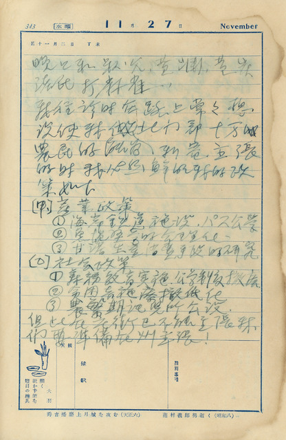 此係吳新榮寫於1935年11月27日日記,晚上和黃淵、黃炭等人打麻將;預想若參政欲從產業政策和社會政策兩方面著手北門郡農民的利益。   北門一帶臨海,土地鹽質含量高,不利農植裁種。加上地處臨海,交通不便,當地住民多以務農、漁業維生,考量農家在農務繁忙時期無法專心照顧孩童,特別設立農務繁忙期專用的託兒所,文中所指的託兒所與保育園和幼稚園的目的不同,而是屬協助一般民眾的社會福利事業,有保姆、看護婦等陪同,託兒年齡、託兒時間也有其規定。1935年11月22日,台灣第一次地方自治選舉甫結束,吳新榮參與助選地方自治聯盟的選舉,並獲得不錯的成績。或許因此,長期對地方公共、政治事務保持關心的吳新榮才會設想自己若從政,將由產業面和社會政策面來為北門郡農民爭取資源。