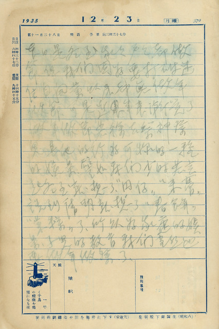 此係吳新榮寫於1935年12月23日日記,今天冬至,許久不曾過節,今天以娛樂的方式過這久違的節日。   在鄉土文化與傳統民俗方面,受新式教育、身為醫師的吳新榮主張打破迷信,認為應以科學方式思考信仰。(1935年12月23日日記)只是,從多篇日記中也能看見他尋著傳統民間儀式獲得心靈慰藉的描寫,無論是參加母親主辦的「謝神補運」儀式(1937年4月24日),或是次子南河生病時,他便也燒香奉拜,祈求平安(1938年6月8日日記)。尤其是在毛雪病逝後,他便想著許多與迷信有關的徵兆,並為此感傷。(1942年3月28日日記)這一天是冬至,這篇日記提到自開設佳里醫院以來,為打破迷信,已很少過節日,但是,在這些儀式當中,若去除祭拜鬼神的部分,單以家庭娛樂和孩子教育等方面觀之,過節本身也是有趣的。