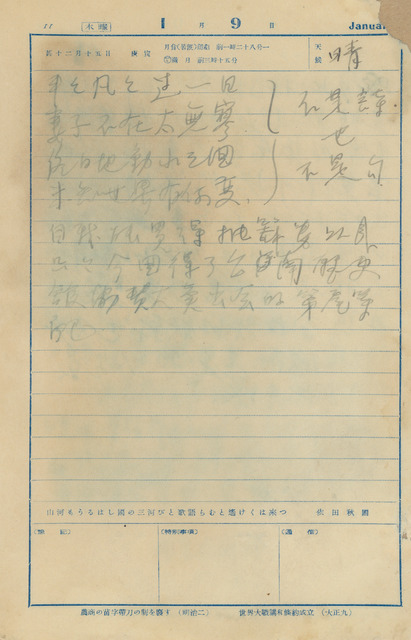 此為吳新榮記載於1936年1月9日日記,今日吳新榮平凡的過了一天,因妻子不在家顯得吳無聊,而有少少的地震,吳新榮也在思考是否世界有因此變動,而在台灣博覽會上購得的抽獎券抽中最末獎,是台南歷史館所大拍賣的獎品,這是吳新榮首次中獎。   本日吳新榮無繁忙的看診,而妻子也不在身旁,雖有地震,但並無大礙,然日記中提到的台南歷史館,為日本時代所舉辦的始政四十周年台灣博覽會之分館,台灣博覽會分為第一會場、第二會場、分會場、第三會場以及各地方館,第一會場分別有滿州館、林業館、府縣館、朝鮮館、福岡館等,第二展場為國防館、電器館、專賣館等,分會場則有南方館、菲律賓館、暹邏[泰國]館等,第三會場在草山溫泉地,最後是各地方館,是台灣有史以來舉辦最大的全島大型博覽會,舉辦目的除了對國際展示日本對於殖民地治理的成果外,也帶來巨大的營利商機;吳新榮在1935年11月6日日記中提到,與妻子毛雪芬共遊台南歷史館,觀賞安平第二會場與水族館,再去第一會場和古董館,從這裡可以知道當時台灣博覽會是規模龐大的活動。而抽獎活動是當時日本時代推廣的活動,舉凡集章、抽籤、抽獎等,是當時盛行台灣的休閒。