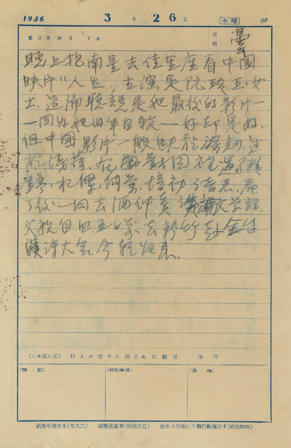 此為吳新榮記載於1936年3月26日日記,晚上與兒子吳南星去電影院觀賞人生這部影片,而在電影院巧遇林精鏐、郭水潭、葉向榮與莊培初,觀賞完後前往菸酒公賣局聚餐。而今日父親吳萱草由新竹返家。   本日日記提到阮玲玉為中國默片演員,為1930年中國影壇著名的演員,而台灣在1898年時導入電影,由日本佛教真宗少年教會,在台北北門舉辦的少年教育映畫幻燈片,開啟台灣豐富的電影歷史,晚餐地點酒仲賣,為日治時期實施的專賣制度而設置的菸酒專賣局,專賣局兼有行政管理權與產銷經營權,嚴格管制台灣各地煙酒市場,其目的為增加政府收入外也保障退休官員與紳士的生活。