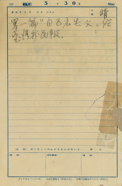 此為吳新榮記載於1936年5月30日日記,吳新榮利用閒暇之餘,撰寫了一篇〈自己廣告文〉投稿給《臺灣新民報》。   本篇日記提到,吳新榮利用空閒的時間撰寫了一篇〈自己廣告文〉,投稿到《臺灣新民報》,而日記中提到的臺灣新民報前身為台灣民報,而台灣民報創刊於1923年,是號稱台灣人唯一的言論機構,原先是以漢文全版,但在1937年後僅可刊登漢文詩,其主要對政治、社會運動的強力支持,鼓勵農民、勞工、婦女爭取自身權益,也支持學生運動、文化啟蒙運動、台灣議會設置請願運動,也呼應要求台灣自治及抨擊台灣總督府。也有許多臺灣作家會刊登投稿自己的作品,台灣新民報也是吳新榮經常投稿的報社。