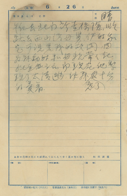 此為吳新榮記載於1936年6月26日日記,下午吳新榮前往北門診察,順道前去西山拜訪親戚。   本日下午,吳新榮前往北門為病人診察,順路前往拜訪住在西山的舅舅,吳新榮回憶,在兒少時期,在舅舅家中生活過,讓吳新榮有感懷之意。日記中提到往診,為日治時期醫生尋找病人的醫療活動,一方面提供到府就診,一方面培養人脈,不只擴展自己的醫療地域,也為佳里地區的民眾提供方便的診療方式,在吳新榮的日記中經常可見往診的活動,除了騎腳踏車或摩托車當交通工具外,也會隨身攜帶軍鴿,在診療後開立處方箋,讓軍鴿送回藥局,可以有效率的通知藥局開藥。在1932年時,吳新榮接下叔父吳丙丁在家裡的醫院,當時事業剛起步,看診人數也越來越多,讓吳新榮有擴建醫院的想法,也付出行動,其經濟上的壓力也時常把吳新榮壓得喘不過氣,有時醫院病患過少或是往診時讓民眾賒帳,但入不敷出的日子依然能在日記中看見。