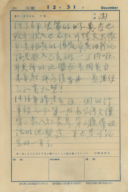 此為吳新榮記載於1936年12月31日日記,為1936年最後一日,來看診的病患也增加了不少,雖說也多些收入,但因擴建醫院等等支出也很多,由此可知道吳新榮在佳里地區的聲望與口碑已受到民眾的喜愛,日記後段吳新榮提到,在1936年嘗試了許多事情,一、進入與退出台灣文學,二、走進社交圈,三、在政治圈得到肯定。   本日日記記載,吳新榮回顧1936年的種種,在1932年時,吳新榮接下叔父吳丙丁在家裡的醫院,當時事業剛起步,看診人數也越來越多,讓吳新榮有擴建醫院的想法,也付出行動,其經濟上的壓力也時常把吳新榮壓得喘不過氣,有時醫院病患過少或是往診時讓民眾賒帳,從這裡可以看出吳新榮照顧佳里地區居民,也常常跑到外地幫忙,這也展現吳新榮仁心仁術的一面。