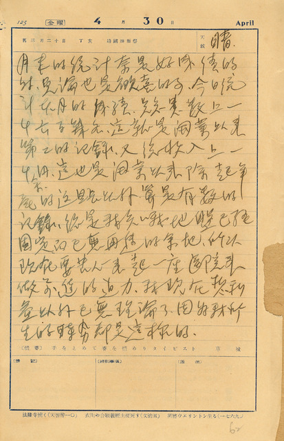 此為吳新榮寫於1937年4月30日之日記。月底吳新榮統記了這個月的業績,是開始經營醫院以來第二高的成績,心中感到開心。吳新榮也評估自己的勢力範圍已經固定無法再增加,所以打算新蓋一間醫院,追求更多的利益。   日記中可以看到吳新榮醫院經營有成,這樣的經營有成主要是建立在吳新榮勤於「往診」的原因下,日治時期的社會風氣不是病人去診所找醫生為主,而是醫生去病人家中看病,透過這樣的關係建立了彼此的信任並鞏固了所謂的「地盤」,吳新榮不只在政治上、文學依著北門一帶發展出了自己的勢力範圍,醫療上也同樣有如是成就,在當時的傳統許多醫師會自己默認自己的地盤,就不會互相「搶生意」但還是會有競爭者出現,造成了往診這樣的風氣一直延續。