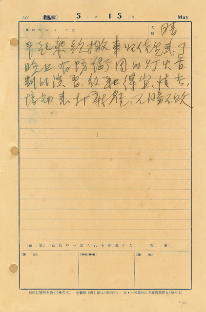 此為吳新榮寫於1937年5月15日之日記。吳新榮因為昨日看診太晚,只得今日作頭班車回到佳里。晚上參加了防衛團的燈火管制的演習,結束後與謝得宜、徐清吉、莊培初打麻將。   日記中提及防衛團,這是在日本推行皇民化運動後,需要更多警察以外的人手來加強地方的控制和秩序維護,防衛團便是這樣的民間組織,除了擔負起上述事項外,也分成各種組別如燈火管制、防火、防毒、防彈、救護等工作,透過這些演習和訓練以應付戰爭後的緊急必要措施。吳新榮在同年3月28日便有記載其屬於地方防衛團的一員。