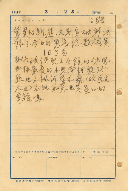 此為吳新榮寫於1937年5月28日之日記。這天看診人數突破以往記錄,達到103名,吳新榮雖然醫院「生意」興隆,但沒有休息時間,甚至小兒子有發燒症狀都無法診療,反思如此生活是否幸福。   日記中吳新榮的醫院事業蒸蒸日上,除了可能因為接近夏天越來越多疾病活躍以外,也歸功於他「往診」的認真打下的基礎,有了固定的地盤和客源。但在如此繁忙的生活下,想要兼顧文學、家人、政治等面向就相對不切實際,吳新榮曾多次分享他的幸福觀,現在這樣的生活雖然能夠獲的許多金錢,但根據他同年4月26日之日記來看,沒有自由的時間並不能讓吳新榮認同現在的幸福觀。