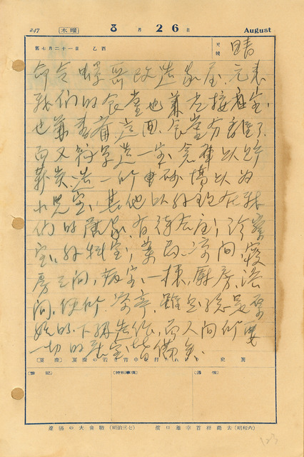 此為吳新榮寫於1937年8月26日之日記。吳新榮請吳蟬幫忙改造屋內格局,新的格局有待合屋、診察室、外科室、藥局、涼間、寢室、病房、廚房、浴室、廁所、涼亭等,甚至新增了兒童間和簡單的倉庫等,雖不豪華但一應具全。   日記中可以看到吳新榮改造了屬於自己的家舍,現在可以看到吳新榮的故居「小雅園」便是吳新榮一生不斷改變並打造的家園,在同年4月19日有提到他的目標是趕快安定有屬於自己的房子,他後來也在小雅園安定下來,小雅園緊鄰吳新榮的佳里醫院,可以兼顧妻兒,又可以方便工作,更成為許多文人雅士聚集之地。吳新榮在日記中要重新規劃房內格局,也是為了給兒女更好的生活環境,至今看到其兒女在撰寫回憶父親的文章時,小雅園都是重要的兒時回憶,可見吳新榮再打造家園上之用心良苦。
