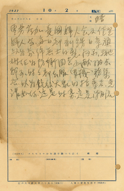 此為吳新榮寫於1937年10月2日之日記。毛雪參加了愛國婦人會和佳里婦人會,每天都為了前線軍士縫製慰問品。吳新榮也必須參加防衛團、軍機獻納會等組織,時常得去集合並給與大眾指導。   日記中提及了婦人會、防衛團、軍機獻納會等組織,這些都在戰爭期間有相當活躍的發展,其中婦人會是原本在日本本地發起,原本目的是慰問及照顧士兵及其家屬,後來傳到殖民地加上戰爭全面爆發,除了負責支援前線戰士的後勤工作外,更有宣傳大日本帝國的愛國思想,再臺南就有固定的地方據點,至今已被列為市定古蹟。而除了上述婦人會以外,吳新榮多次參與的防衛團是一種戰爭期間的地方維持治安的組織,在日記中因應戰爭期間,防衛團出動的次數也與日俱增。最後的軍機獻納會,是日本在戰爭開展後,朝日新聞社開使用標語煽動愛國情操,邀請民眾捐款,這也影響到了殖民地,因此包括吳新榮也有到各處募集國防獻金的日記記錄。不論哪個機構,都可以看出戰爭趨於白熱化的過程,以及日本在中國加速侵略的大時代背景,臺灣作為殖民地,島內的人民開始受到日本高壓的統治模式,基本上無權反抗,只能順應殖民母國帶來的思想與命令,因此日記變以「這是時勢,這是潮流」作為時代背景下的註解。