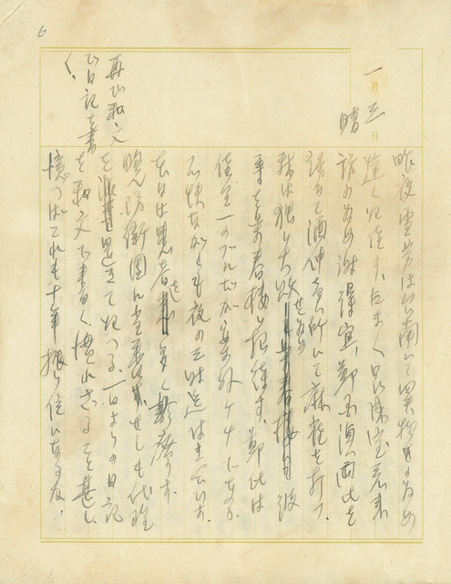 此為吳新榮寫於1938年1月2日與1月3日日記, 1月2日,因妻子較晚返家,碰巧友人來訪,便邀友人一同到酒配銷所打麻將,再赴樂春樓喝酒至深夜。1月3日其於醫院診治病患,再找代理人赴 防衛團輪值。吳新榮提及相隔十年後再使用日文寫日記感覺不甚習慣。   日記中的防衛團為日本進入戰爭時期成立的民間防衛組織,主要目的為協助戰時民間防衛機制以及訓練民眾挑水、消防、燈火管制、交通、避難等相關事宜。平日則負責巡邏鄉里、清理水溝等公共事務。   又,日記中提到約有十年左右未用日文寫日記,約十年前,吳新榮求學於日本,聽了自由主義者鶴見祐輔的演講,鶴見祐輔說道:「不久的將來,日本在滿州要再演一回的流血!」等關於帝國主義侵略的言論,使吳新榮對政客包著新自由主義外皮實行帝國主義暴行產生莫大的失望,便投入左派領導的東京臺灣青年會。1929年發生四一六事件,田中義一內閣大肆搜捕左派人士,吳新榮亦受牽連入獄,相關的印刷物、日記皆被沒收,成為了官憲對其定罪的證據,往後十年間,吳新榮決心不寫日記,直到東京醫專畢業後,吳新榮返台從醫,他認為自己非實際運動家也非組織內份子,便開始重拾寫日記的習慣,起初以漢文寫作,直到1937年,中日戰爭爆發,臺灣總督府積極推行廢除報紙漢文欄政策,1938年的1月1號開始以日文書寫日記。
