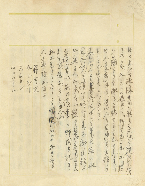 此為吳新榮寫於1938年1月7日日記,昨晚,街民總出動歡迎歸來的軍伕,從軍伕口中聽聞他們未直接參戰,使其感到離和平之日應該不遠。另外其認為,在日本的國力不斷膨脹下,可以北侵樺太島、沿海洲、勘察加,南掠菲律賓、東印度,除了資源外更可以支配這些島嶼周邊大洋。佔領這些區域可以使日本成為名副其實的「島帝國」而不釀成「東洋悲劇」,能轉變「白人支配」成就「黃種人之自由」,最後列舉該時期之偉人並暗指日本的眼光短淺。   日記中提及的軍伕,1937年對中國戰事的人力與資源不斷的擴大,日本內閣該年8月24日宣告國民精神總動員,臺灣總督府方面也徵調台籍軍伕前往前線支援,工作主為運送輜重,1937年12月8日,臺灣總督小林躋造向總理和內閣各大臣提出了〈關於支那事變收拾方法之件〉意見書,陳述臺灣供給人員與物資的優勢,促使1938年臺灣增調農業生產團,以及精通閩南語、北京話、粵語的通譯赴中國戰場。   又,在日記中,吳新榮以分析式的觀點提出日本若拿下樺太島、沿海洲、勘察加,南掠菲律賓、東印度等地,不但可以獲取優渥的資源外,更能支配各大海域。另外,奪回「白人支配」的殖民地,實踐「黃種人之自由」,成就所謂的島帝國,這才是與大敵戰鬥的遠大目標,如今卻選擇侵略中國為首要目標,在吳新榮的眼中,這只會釀成「東亞悲劇」,使亞洲人們無法一致對外,對抗來自西方的帝國主義、殖民主義的威脅。當時中日戰爭開打以逾半年,日本的重心集中在中國戰場上,直到1938年11月總理大臣近衛文麿發表「第二次近衛聲明」,號召建立「大東亞新秩序」、1940再度發表聲明,與德、義結盟,粉碎歐美列強的統治,解放殖民地,1941年後,日本開始陸續佔領香港以及東南亞,向英、美宣戰。