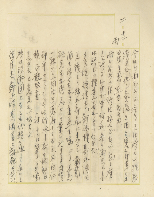此為吳新榮寫於1938年2月11日日記,傍晚,友人赴吳新榮家中拜訪,談論中,一致認為白仁郡守採取法西斯行政;吳新榮請人代理輪值防衛團,自己則與友人打麻將。   吳新榮日記中時常提及病患來診與天氣間的關係,這天,吳新榮對冬天又下雨氣候下仍有40多位病患來診感到十分罕見。   又,日記提到部落整頓、正廳改善運動,為皇民化配套措施。部落整頓為市區重建計劃一環,其工作首先將擋路、老舊的房子拆除,修築馬路,將市區規劃整齊劃為目標,吳新榮日記2月21日中提到市區計畫修正、部落整頓一事。正廳改善運動由各地官廳各別推行,鼓勵家家戶戶祭祭祀神宮大麻,藉此灌輸殖民地身為皇國子民的認同感,隨著戰事愈緊迫,正廳改善運動政策在雷厲風行下達成效果,大部份臺灣家庭改祀神宮大麻,不過傳統祭祀豈是一朝一夕就能抹煞?民間仍私底下祭祀祖先與傳統神祇。