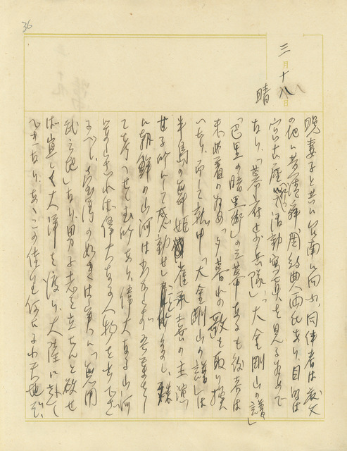 此為吳新榮寫於1938年3月18日日記,晚上偕同妻子與友人赴宮古座欣賞電影,對朝鮮半島舞姬崔承喜主演的「大金剛山之譜」印象深刻。   大金剛山之譜為1938年1月21日上映,吳新榮對電影動人場面印象深刻,尤為讚嘆朝鮮山河之美,並藉以反思,從日記中「沒有偉大的山河,孕育不出偉大的人物。像在臺灣這麼小,實有無用武之地」一段,吳新榮舉朝鮮壯麗山河對比臺灣尺寸之地,說明在臺灣,許多身懷抱負的有志之士無用武之地的渺小,最後視角又縮小為佳里一區,暗喻自己比起那些無用武之地的人士,又更微不足道。   又,黃清舜即黃清舞(1905-?),為黃清澤之兄,乳名清舜。字遂園,號西蕉,台南縣將軍鄉人。台灣總督府醫學專門學校畢業。曾任將軍庄公醫、嘉南大圳組合議員、將軍庄信用組合監事、理事等。1946年至1959年被選為將軍鄉鄉長。日本名為大林正治,其與吳新榮友情甚篤,時常在吳新榮日記中被提及。