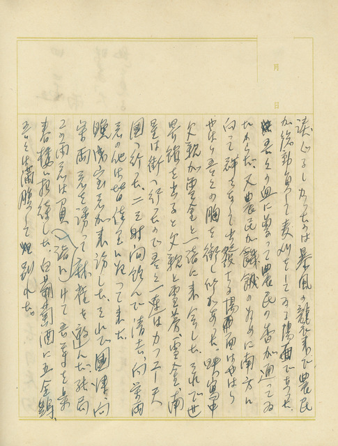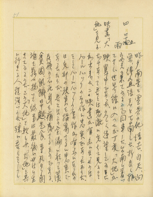 此為吳新榮寫於1938年4月25日日記,其偕同妻小、友人赴世界戲院欣賞「大地」這部電影,散場後與友人赴天國咖啡館;晚上邀友人打麻將後再赴樂春樓喝酒。   日記提到「大地」美國製作拍攝的電影,劇本原著為賽珍珠《大地》,內容描寫中國農民為了生活,堅韌不屈的故事,吳新榮對電影劇情感動不已,除了表達自己對農民奮鬥精神感動外,對大地的熱情、血液中曾留有農民的香味也體現吳新榮對大地與農民切不斷的血脈關係,在數篇日記中,吳新榮也多次表示,即便臺灣面臨日本殖民同化手段,在民族、血緣上,仍改變不了身為中國人的本質。   又,吳新榮利用僅有閒暇時間與家人看電影,與友人上酒館飲酒、打麻將,雖然休閒娛樂在日記中頻繁被提及,但可以看出吳新榮忙碌日常,尋找樂子也是不可缺少的一環。