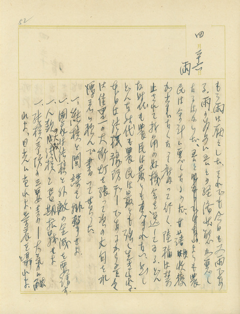 此為吳新榮寫於1938年4月26日日記,對於連續雨天感到煩悶,抱怨雨天帶來的不便;其提及因應肺結核預防的街上一景。   當時正處於梅雨季節,冷熱空氣交鋒造就頻繁降雨日常,這便苦了吳新榮,因為下雨,所以病患前往診所意願低落,使他對經濟收入開始苦惱,雨季,也苦了農民,甘藷無法收成、旱稻禁止種植,農民仍然堅強的生活著。抱怨之餘,吳新榮仍欽佩農民不折不撓的強韌精神。   又,結核病預防,為了加強保建與衛生知識,日本殖民政府將每年4月27日定為「結核預防日」,27前後三日為「結核預防週」,殖民政府舉辦各項宣傳,藉以普及社會大眾對防結核病的知識。隨後因應戰時體制特殊情況,重視人力資源為其中一環政策,殖民政府時常不定其舉辦,加強宣導。日記中提到對抗結核的標語十分有意思,將結核與外敵、間諜並列,視為全民公敵,希望藉此喚起防疫精神。