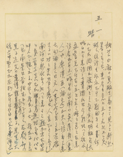 此為吳新榮寫於1938年5月1日日記,初夏將至,其對於診所生意增加,週遭氣氛活潑略感喜悅;對於數日以來訪客不斷一事略感應接不暇;敘述次子吳南河自返家後患支氣管炎一事,連帶提及子女特徵。   訪客來訪一事;葉陶為高雄人,幼時就讀於漢書房,及長後進入和平(第三)公學校就讀,在女性纏足盛行的該時期,主張捍衛自我主體意識,拋去裹腳布,為少數具備先進思想的女性之一,公學校畢業後進入臺南教員養成訓練所,並成為ㄧ名老師,返回母校任教;日本殖民統治時期其亦參與台灣農民組合、臺灣文化協會等團體,並結識同為社會運動者的丈夫楊逵;另,廖漢臣為艋舺人,為詞作家,老松公學校肄業便四處工作,然而其喜好閱讀、博覽群書,漢文寫作基礎深厚;其曾參與1930年代臺灣新舊文學論戰、擔任報社記者,後在從事新文學創作期間有劇本、新詩、民間故事、小說等作品的產出。   又,吳新榮平時交友廣泛,亦參與與組織許多不同層面的交誼團體,如佳里青風會、臺灣文藝聯盟佳里支部、旭翠會、東京醫學士會臺灣支部等等,這些組織中接觸來自四面八方人士使得吳新榮赴約不斷,其中有當年東京醫專就讀的同學、臺南佳里一帶文學人士、知識份子等等,透過不同組織定期聚會聯絡情感,並建立人脈網路,即使吳新榮日記稱自己非孟嘗君,卻有邁向孟嘗君的潛力。