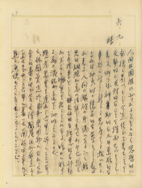 此為吳新榮寫於1938年6月9日日記,晚上帶長女吳朱里赴六甲;次子吳南河病情好轉。   日記中,對於「病急亂投醫」一事頗為後悔,不過這也充分顯露出他對於兒子久病不癒焦急的心理,及身為父親為孩子赴湯蹈火的偉大父愛,從6月7日日記中,眾人別無他法之下,吳新榮不得不寄託於傳統信仰的力量,燒香拜佛,只為祈求神明保佑孩子病情好轉,不過此舉實在有違身為醫師邏輯認知、科學至上的本能,相信非到束手無策之際,吳新榮也不會採用此法。