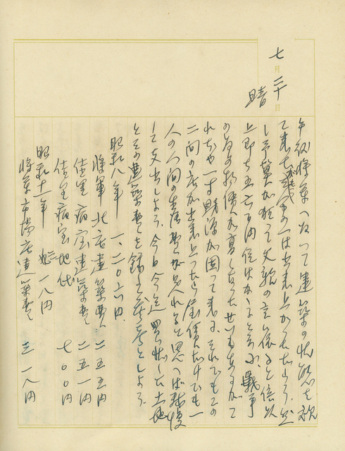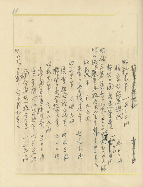此為吳新榮寫於1938年7月20日日記,紀錄將軍住宅建築進度、預算相關情形。   日記中吳新榮提到建築費用可能會比原先高出一倍以上,而產生財源上的困難,為此,他分析,投入資金整修完兩間店面,往後藉著房租便可得一人的生活費,決定咬緊牙根支出建築費,自所附資料中,昭和八年(1933)到十三年(1938)間投資建築與購地費用加上償還金額部分,在當時可並非小數目。 又,其時常於日記中提到開銷吃緊、入不敷出等擔憂,一來為進入戰時體制後的經濟管制、物價上漲,使得生活開銷吃緊,二來主要收入來源的診所每日來看診病患不一,若生意稍差,便可能如1月13日日記中入不敷出,最後,因自己為家中主要的經濟收入來源,故在金錢的支出與分配皆須精打細算,才不致不敷使用。