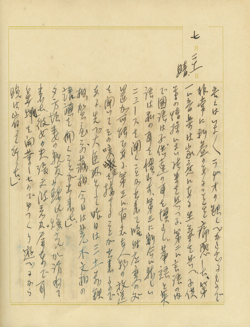 此為吳新榮寫於1938年7月21日日記,寫道購買收音機後的益處;晚間,妻子友人來訪。   吳新榮於日記中提及收音機的益處,自7月14日購買收音機後,與外界接觸管道更為方便,可即時得知政府公告、新聞,亦可聽音樂陶冶性情、訓練語文聽力。當時收音機使用尚未普遍,據統計,1938年台灣平均每千人有收機機的比例為8人,雖然於亞洲地區算名列前茅,但擁有者可謂屈指可數,值得注意的是,皇民化運動推行期間,總督府積極推廣收音機使用,於部落振興運動選定示範村落內,規定配置收音機,而農村部分,也於廟宇的農村集會所設有收音機。