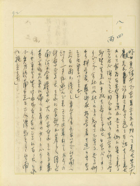 此為吳新榮寫於1938年8月4日日記,日記中提及昨日(8/3)黃大友來訪一事;傍晚,帶著長子吳南星前往台南。   吳新榮藉著黃大友來訪一事,說明身邊聚集許多有為的青年一事,吳新榮交友廣泛,組織不少團體,與這些友人定期聯繫,這些團體有關心社會、政治、實事的「佳里青風會」、與東京醫專友人「東京醫學士台灣支部」、文藝界「台灣文藝聯盟佳里支部」、還有「旭翠會」等組織,由此可以看出吳新榮涉獵廣泛,友人也各界遍佈。   又,吳新榮曾經說過台南為他心靈的故鄉,每每前往台南他都會逛街、看電影、吃點心、找朋友、按摩,據其形容,若少做一項就回家,仿佛沒到過台南或是掉了什麼在台南,以上可見其對台南的神往。