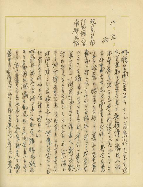 此為吳新榮寫於1938年8月5日日記,昨晚(8/4)偕同長子吳南星赴台南後夜宿王烏硈家;5日上午,因天氣不佳,決定於台南多玩一日;與南星赴台南博物館、歷史館,再赴宮古座看電影;晚上,因豪雨導致道路中斷,只得暫著友人黃奇真家;與黃奇珍至許久未到的藤川舊書店一逛,然而因身上錢不夠,而無法購買《臺灣全誌》8冊。   1901年,日本殖民政府擬於紀念北白川宮能久親王病逝的「北白川宮殿下御遺跡」神社旁之吳汝祥舊宅成立臺南博物館,是故,該館於1902年2月26日正式開幕,成為台灣最早的官立博物館,內部展示物有許多標本、學術儀器、農業園藝、漆器、藝術品等等,1922年為因應臺南神社的興建而由原址遷至州廳旁的兩廣會館(今南門路接近圓環處),後改名為臺南州立教育博物館;歷史博物館正式開幕於1937年10月1日,亦為臺灣第一處歷史博物館,其館內1樓藏有大量畫作史料、古物之蒐藏(如日記中清代的匾額),二樓則有1935年臺灣博覽會臺南展區由小川篤四郎之畫作。   又,《臺灣全誌》為日人鈴村讓以10年時間於日本本島、臺灣、中國蒐羅臺灣相關史料整理編輯後,交由臺灣經世新報社重新以活字排印彙編為《臺灣全誌》,並於大正11年(1922)完成。