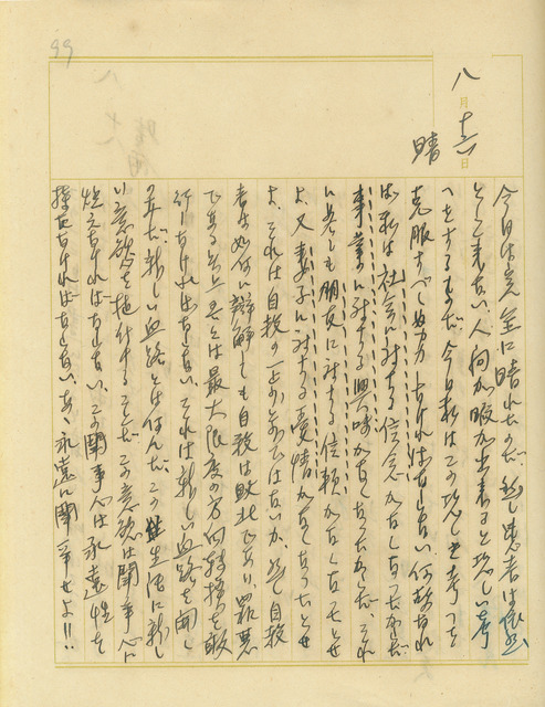 此為吳新榮寫於1938年8月16日日記,其表示對社會缺乏信念、對事業缺乏興趣,想找尋意欲重燃自己鬥志。   依平時經驗,只要天氣放晴,診所生意較為熱絡,不過當天卻一改常態,使吳新榮頗感心悶,進而抒發情懷,日記首先提到自己對社會缺乏信念、對事業沒興趣,那麼對朋友的信賴及對妻子的愛情就顯得不可或缺,他認為,如果再失去這兩者,就面臨自殺的地步,自殺即是敗北,所以,他要找尋一個新的奮鬥目標,期許播種新的意欲,永遠地戰鬥,不做自殺的敗北者。