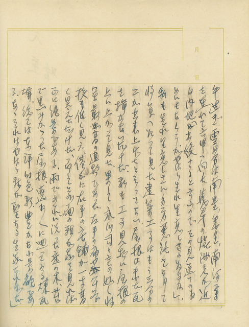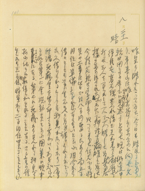 此為吳新榮寫於1938年8月21日日記,昨日(8/20)弟弟壽山前往東京,昨晚,與友人打麻將後前往樂春樓;今(8/21)與父親討論建築款項一事;傍晚,返回將軍察看建築工事情形。   日記中,吳新榮與父親因將軍建宅預算一事進行討論,由於資金不足無法向組合貸款,再說,組合貸款需支付利息,幾經考量後,打算將家中所藏的黃金變賣,換取金錢支付工事費用,既免支付利息且又符合黃金總動員之國策,可謂一舉兩得。   又,傍晚返回將軍察看新建築進度,這次其登上屋頂,眺望左側廟和學校,也望見老家屋頂與庭院,最後於日記中表達對即將完工建築的滿意以及對自己老家景觀之讚嘆。