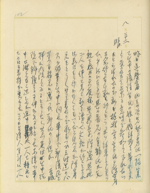 此為吳新榮寫於1938年8月22日日記,昨日(8/21)答應前往台中出席吳登富與張氏訂婚儀式;昨晚與友人散步後,赴酒館飲酒。   日記中,提及在火車行徑過程中,不慎碾死一位農夫,吳新榮認為即使那農夫已傷重到難以救治,身為醫師的自己,即使身邊無任何醫療器具,也起碼能在農夫最後一口氣時給予強心劑、繃帶等支持,作為死亡之途的慰藉,無奈農夫早已傷重不治,自己也只得無奈上車。 又,日記中提及的瑠美為天國咖啡廳女服務生,同時也為吳新榮友人,黃百祿的二夫人。