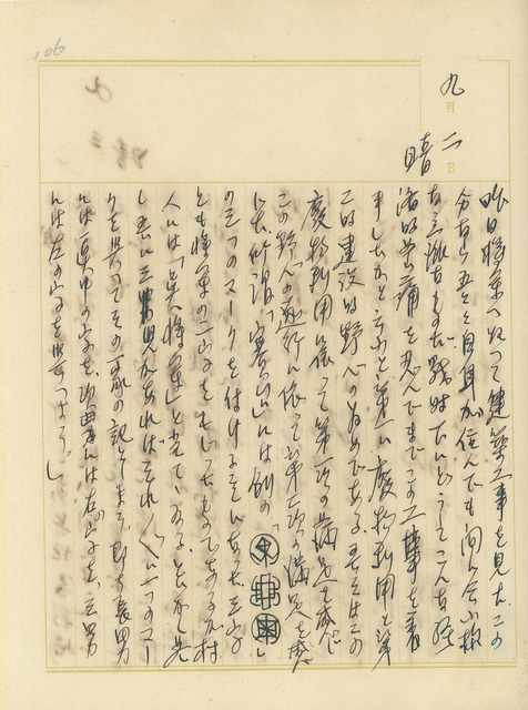 此為吳新榮寫於1938年9月2日日記,描述對自家建築工事的成就感以及未來展望。   自建築工程開始至完工,吳新榮時常提及對建築工事不放心,頻繁前往觀看進度,並將細節詳盡記錄於日記中,由此,可看出其對將軍建築的重視與期待,另外,建築工事從開始到完工,中間支出相當龐大,對價格估摸與運用考量,也可見於7月20日記中,當建築準備完工之際,其看著即將完工的建築,滿懷期待,也對自己廢物利用、實踐野心感到滿足。   又,賽台上三字為吳新榮親自設計之家族徽章。
