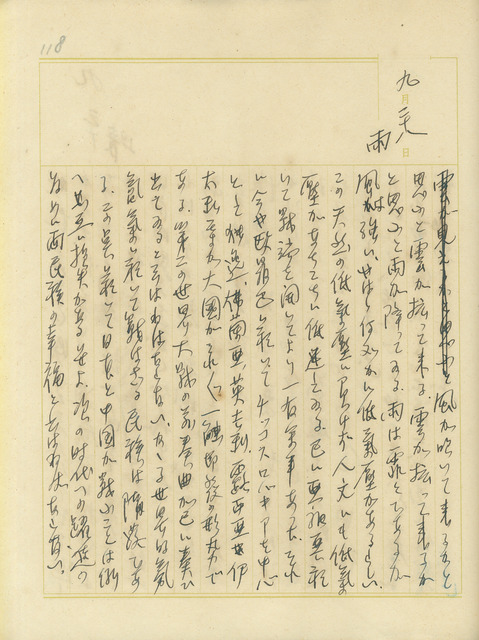 此為吳新榮寫於1938年9月28日日記,藉低氣壓引起的天氣變化,進而點出人間低氣壓亦處處低迷,一來為歐洲戰場之緊張對立,戰爭看似一觸即發,而對於亞洲的中國、日本一戰,則抱有順應時適之感。   1938年間,歐洲情勢變幻莫測,雖尚未爆發大規模戰役,英、法等大國對德國予取予求採取綏靖政策,姑息德國與捷克、斯洛伐克間的關係,1938年9月,英、法、德、義簽訂慕尼黑協議,強制將捷克、斯洛伐克的蘇臺德地區割給德國,歐洲大戰幾乎一蹴可幾。   又,日記中提到不戰的民族只有墮落一途,意指戰爭已蔚為風氣,只能順應時勢潮流,即使最後兩敗俱傷,卻可促成中、日兩民族下一代的躍進與幸福。
