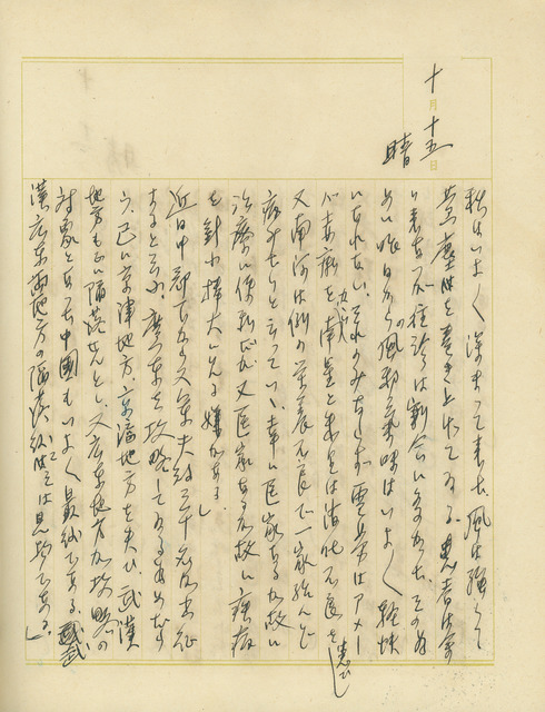 此為吳新榮寫於1938年10月15日日記,描述入深秋之天氣風貌以及診所、往診病患數量。另外,家中妻小也同時處於掛病號的狀態;吳新榮提及軍夫徵召一事,連帶敘及了中國戰場局勢。   日記中侵略廣東一事,是年5月,徐州淪陷,日軍逐步進逼武漢,中、日雙方展開長達4個月餘的武漢會戰,該戰役橫跨安徽、江西、湖南、浙江、湖北省。武漢為中國經濟、政治、軍事重心,且當時華北、華中所撤退的人力與資源皆於武漢,尚未後撤至重慶,所以國軍屯駐主力重兵於武漢佈署,打算以時間換取空間,爭取這些人力與資源向西南撤,不過據吳新榮的日記來看,其與日本軍、中國遠征軍看法一致,皆認為武漢淪陷,中國也隨之戰敗。