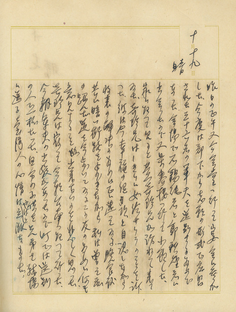 此為吳新榮寫於1938年10月19日日記,昨日(10/18),赴公會堂出席志願役軍夫送別會,會後,與友人赴樂春樓小酌,晚上在與黃奇珍散步、聊心事;19日,赴戰場的軍夫出發。   日記中,吳新榮對黃奇珍步上自己的後塵甚是擔憂,卻也無法提供任何意見,從9月19日日記中可以看到,黃奇珍寫了一封情書給酒館女子「櫻」訴說自己的愛意,如今一則以喜、一則已懼,喜,則是處於幸福之巔峰,懼,則擁有家室的黃奇珍應當去擔憂未來將面對感情世界的紛紛擾擾,身為過來人的吳新榮也只得聽聽便罷。