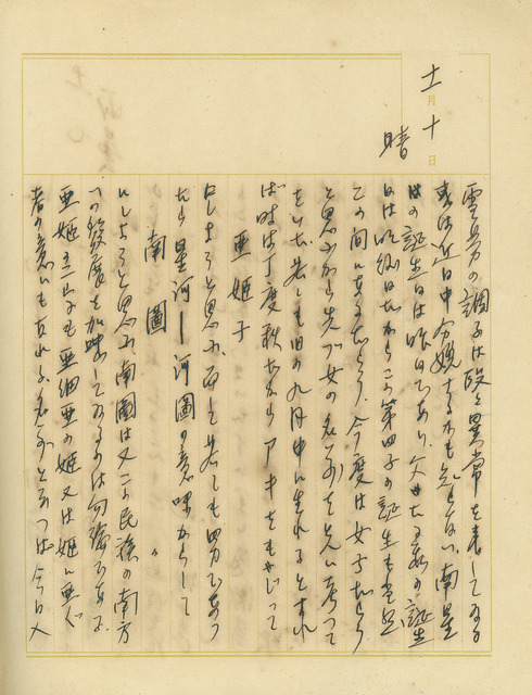 此為吳新榮寫於1938年11月10日日記,見妻子毛雪芬身體情形推測近日內即將分娩;日記中記錄給孩子命名一事,連帶也提及了所寄託之期許。   如同一般父母為即將出世的孩子取名,日記中,可以看到吳新榮取名的靈感與由來,例如亞姬子為「秋天」日文的諧音「あき」而來,南圖則是跟隨著兩位哥哥,南星、南河之名而來,靈感則是根據星河─河圖之意,河圖即為星圖,屬天上星宿,蕴含深奥的宇宙星象密码,為中國古文明圖案之一。   又,每位家長皆希望「望子成龍,望女成鳳」,其也不例外,他期許能送孩子入小學校就讀,並要求家庭成員盡可能用國語(日語)和家中小孩交談,以期達到進入小學校之門檻,當時大多台籍子弟僅能就讀公學校,進入專門為日人開設之小學校者屈指可數,這些人具備一定身分地位、社經背景,最重要是符合以日語為日語常用者。雖然,日本殖民政府曾於1922年訂定〈台灣教育令〉,表面推行內台共學、消弭差別待遇,實則終其日本殖民統治年間,臺日學生從未真正達到平等。