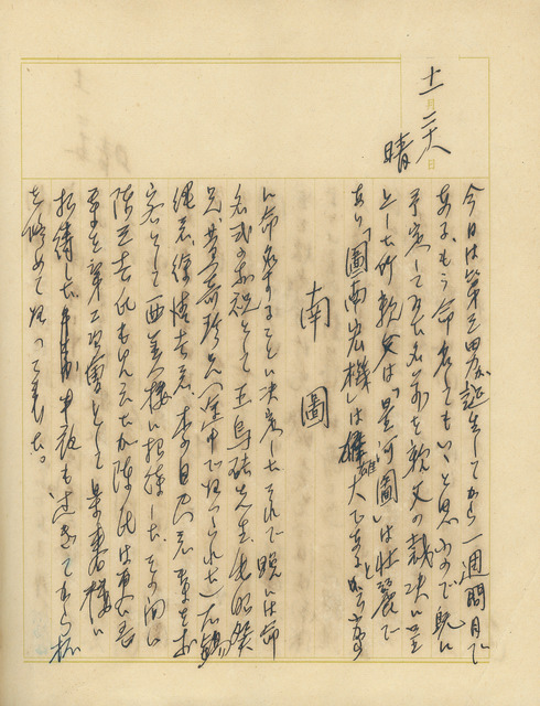 此為吳新榮寫於1938年11月28日日記,完成三子吳南圖的命名;晚上宴請友人慶祝命名儀式,分別赴西美樓、樂春樓飲酒至深夜。   經過數日的抉擇與討論,吳新榮將預先決定的名子呈給父親吳萱草過目,並徵詢其意見,最後決定將三子命名為「南圖」,如先前日記所提及,不論希望南圖如其名般圖南鵬翼還是為因應現狀盼望民族往南方發展,每位父母對孩子的命名皆象徵某種期許與寄託,所以自然十分慎重,連吳新榮也不例外,自孩子出生前就已有規劃,後又陸續徵詢不同友人之意見並參酌古代文獻意境、搭配現時環境,種種考量下,才完成南圖之命名。
