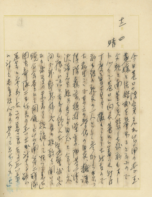 此為吳新榮寫於1938年12月4日日記,與父親吳萱草、長子吳南星一同出席陳穿之結婚喜宴;會中,見到東京醫專留學時期之故友;宴後,聽完新婚夫婦校歌,各自賦歸;晚上,赴公會堂出席臺南第二聯隊岡本部隊之歡迎會。   陳穿為臺南將軍人,為吳新榮老家的鄰居(住巷口),同時也為聚會、文學創作、商討選務的密友之一,日記中也時常出現雙方往來互動的紀錄,且亦有更進一步提到兩人交情的記載,如1938年8月11日、9月17日,其順道至陳穿處借書、吃釋迦;1939年除拜訪陳穿外,兩人亦針對將軍庄組合役員規劃與布局討論,此外,在1939年12月21日記中還提到了自己與陳穿的交情除了為良友般的關係外,更有如親兄弟般的親密。   又,日本殖民統治時期,臺灣方面的步兵聯隊創立始於明治40年(1907),第一聯隊、第二聯隊的駐防以濁水溪為界線,以北屬陸軍第一聯隊、南屬陸軍第二聯隊,1907年11月7日,明治天皇以軍旗授予駐防臺灣南部的第二聯隊,象徵著步兵第二聯隊的使命為「鎮定台灣南部」,而此後每年的11月7日也為步兵聯隊軍旗祭的日子;另外,當時地方上會於部隊、相關人士出征時,為其舉行歡送會,以鼓舞出征在即士兵的士氣,並為其祈福,反之,當其退伍或返回時,為其舉辦歡迎會來洗塵接風。