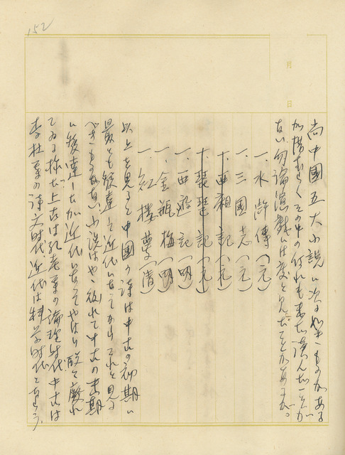 此為吳新榮寫於1938年12月19日日記,為閱讀《精解支那文學史講義》後之心得與感觸。昔日詩人墨客皆有「字」和「號」,所以連帶提及身處於近代的自己,也有類似「字」、「號」的筆名或匿名。   日記中提及《精解支那文學史講義》一書為日本文學家橘文七所著,出版於昭和13年(1938),他對中國古代文學頗有研究,同時也著有《文検参考支那文学史要》、《明治大正文學史》等書,橘文七熟諳中國文學古至今的脈絡,從吳新榮所列舉的古人與小說,可以發現《精解支那文學史講義》一書所論及的範圍上自春秋,下至明清,可謂綜覽了中國文學演變得進程,日記中,吳新榮也得出心得,將古代、中古、近代的價值理念分別列出。
