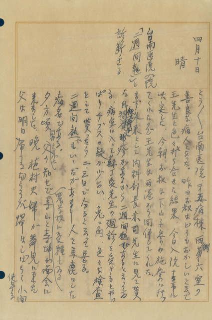 本篇為吳新榮寫於1939年4月10日日記,吳新榮決定入台南醫院接受治療,被診斷為二週間熱,期間有許多人前來探病。 從吳新榮1939年4月4日的日記發現從當天開始身體不適,往後雖有持續接受治療但仍未得到妥當的改善,只能進入台南醫院做更詳盡的檢查治療,在這期間,前來探病的包括吳新榮父親、壽山、壽坤以及植村夫妻,植村夫妻為植村榮宗與其妻子,為吳榮宗的日本名。近期吳新榮因身體因素,1939年4月8日至1939年4月12日的日記由妻子雪芬代筆完成,但此篇原件中,日記末並未記有「雪芬代筆」,將其筆跡考證後,與雪芬字跡一致,故直接在此篇詮釋中加上「雪芬代筆」。