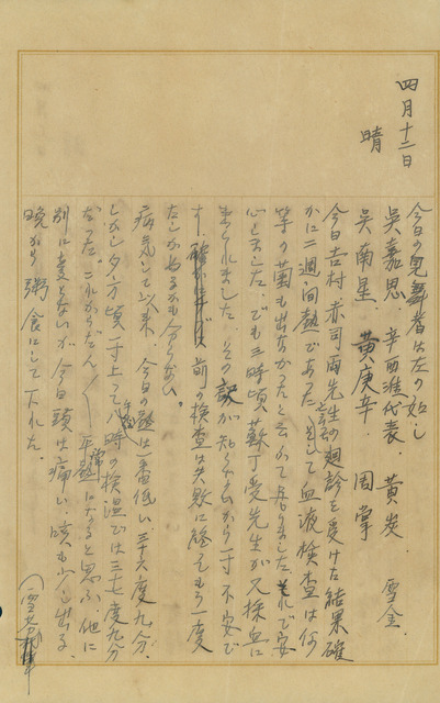 本篇為吳新榮寫於1939年4月12日日記,吳新榮住院期間,許多人前來探視。而今天對於自己的病情有更進一步的了解,體溫追蹤問題也得到緩解,只是仍有明顯的病徵,如頭痛和咳嗽。 吳新榮近期因為身體因素,都待在醫院度過,住院期間仍有不少關心他的朋友前往探病,吳新榮一一將其姓名記錄在日記中,可見他對於來探視的人有誰應該是在意的;吳新榮對於朋友總是熱心助人,也總為朋友解決問題跟困難,平時閒暇時刻也是跟朋友們一起渡過,可知朋友在吳新榮心中所占分量,同時如地方上的政治人物與商人等,吳新榮也略有相交,如此篇日記中提及之辛西淮代表,為台南人曾任保正、庄長、台南市協議會員以及總督府評議會員,並與台南仕紳們創設台灣輕鐵會社任社長之後改組為興南乘合自動車會社。根據吳新榮日記所述,時常在吳新榮的眾多聚會中看到辛西淮的身影,且在辛西淮組織新會社時,吳新榮也參加持股表示支持,兩人可說是生活以及事業上皆有往來之朋友。