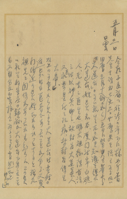本篇為吳新榮寫於1939年5月03日日記,吳新榮外診後順道拜訪友人談文學和歷史,並期待擁有自己的永久住屋。 根據日記所述,吳新榮於1939年4月身體不適,打亂原本的生活與工作,並入醫院治療整整一周,且努力想要恢復原有的生活狀態與工作,從近期的日記來看,吳新榮漸入佳境,並已經開始作外診,與朋友相聚談天等。大道公即為保生大帝,姓名吳本,又是一位醫者,吳新榮感到親切,甚至懷疑自己是否跟大道公關係匪淺。吳新榮很重視自己家庭居住的環境,從日記中可以看到為了病室與後花園的營造事務來看,可以為了裝修重視的地方而努力工作且抱有相當程度的熱誠,甚至不惜向信用組合借建築資金。樂春樓是日治時期著名的酒樓之一,是吳新榮以及台南地區仕紳階級、知識分子和文藝人士流連的場所,同時也是社交娛樂空間,吳新榮藉此來強固其社會網絡。 。